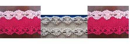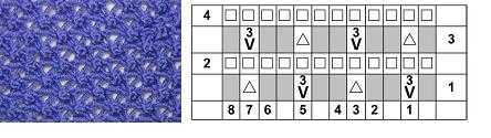 - 3 р.— как 1 р., только смещаем рисунок: 1 кромоч., *3 п. вместе изн., из 1 п. провязываем 3 (лиц, накид, лиц.)*, 1 кромочная.;