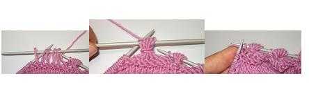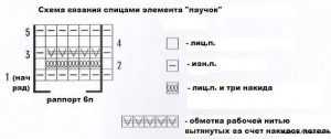 - 3 р. – лицевой, 1 кромочная, *1 изн., все накиды сбрасываем и 5 длинных п. перемещаем на дополнительную спицу. Рабочей нитью 2 раза обвиваем 5 п. против часовой стрелки и слегка затягиваем обмотку. Снимаем 5 п. на правую спицу, не провязывая*, 1 изн., 1 кромоч;