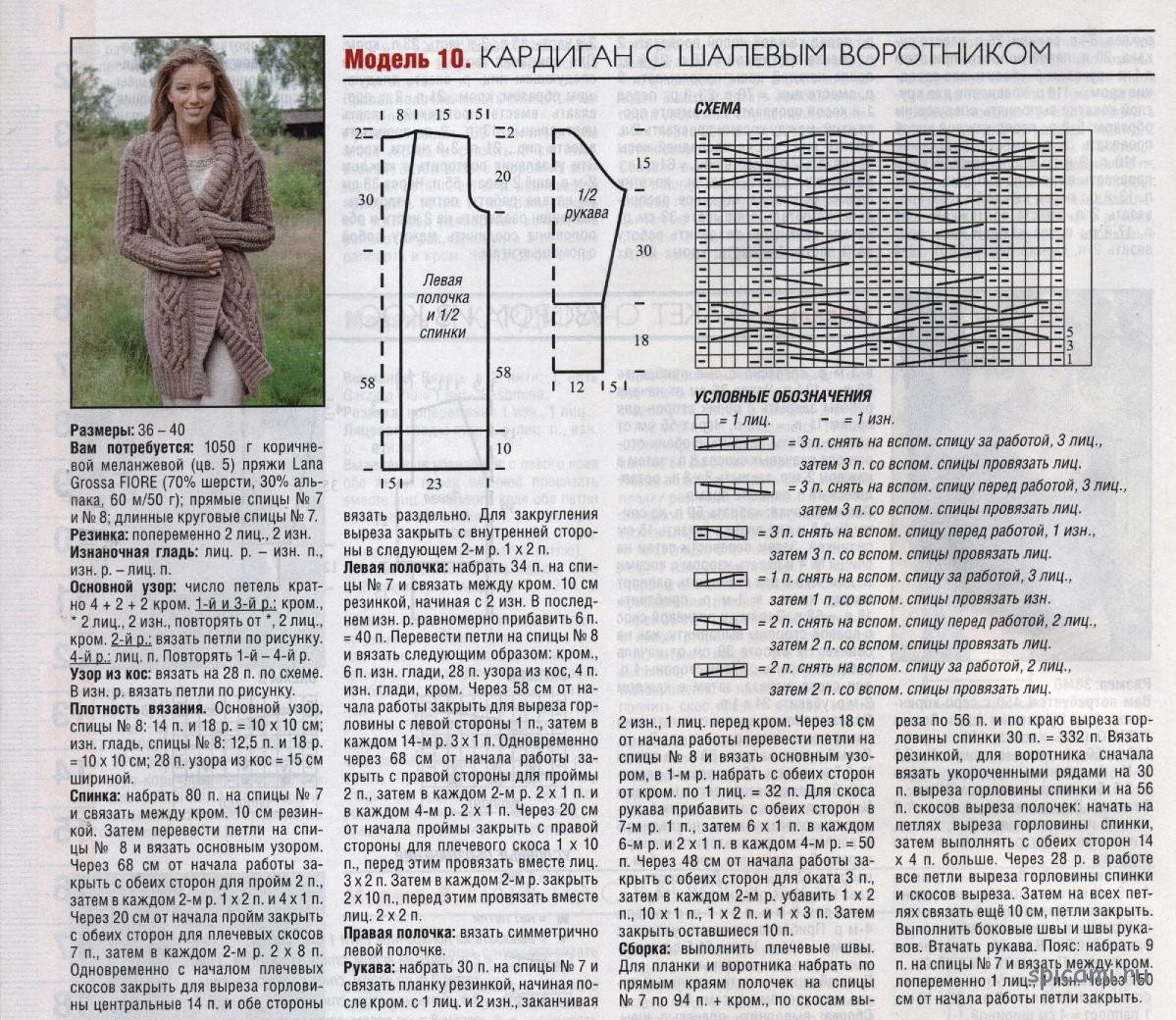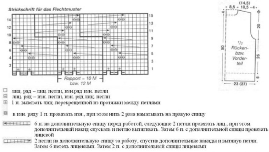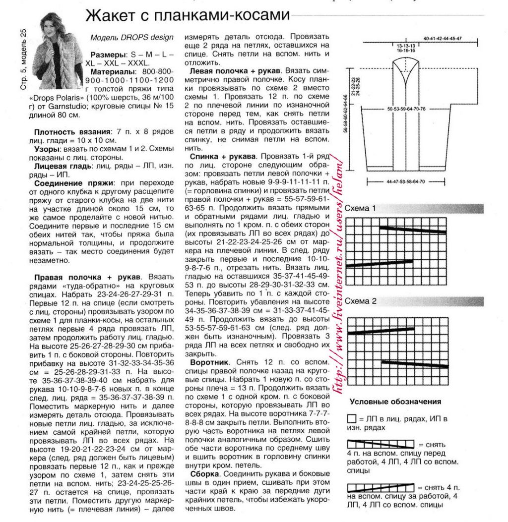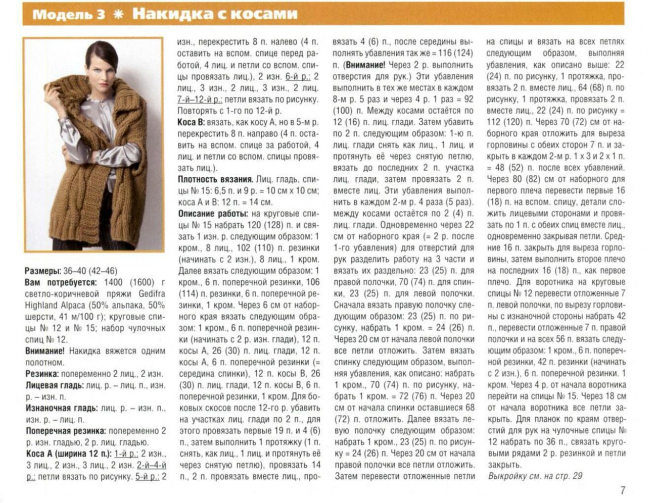 Плотность вязки составляет 13 п. х 18 р. = 10 х 10 см спицами № 7 и лицев. гл. и 17 п. х 18 р. = 10 х 10 см спицами № 7 узором с косами А.