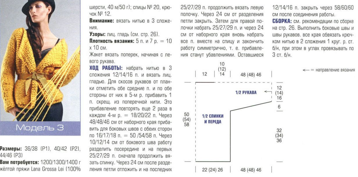 Плотность вязания составляет 8 п. х 10 р. = 10 х 10 см, используя спицы № 12 и 7 п. х 8 р. = 10 х 10 см, используя спицы № 15.