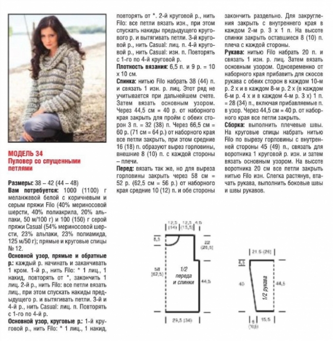 Спицами набираем 64 (70) п. и провязываем их лицев. гл. Убавки и проибавкм для приталивания и проймочек выполняем точно так же, как делали это на передней части свитера. Довязав до высоты в 58 (60) см от наборного ряда, откладываем последние 28 петелек на держатель.