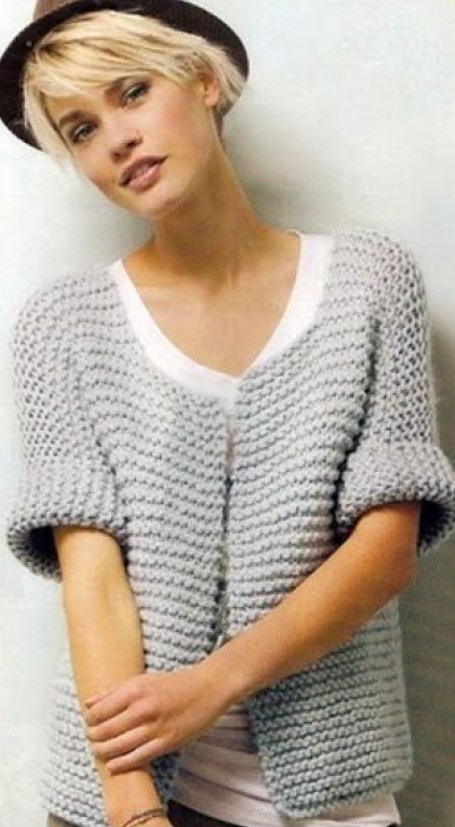 Набираем спицами № 8 24 (26, 28, 30, 32) п., вяжем платочн. вязанием до высоты в 25 см, после чего формируем рукав с помощью прибавлений. Добавляем слева 1 х 1 п., далее в кажд. 2 р.: 1 х 1 п., 1 х 2 п. и 1 х 11 п. У нас должно получиться 39 (41, 43, 45, 47) п.