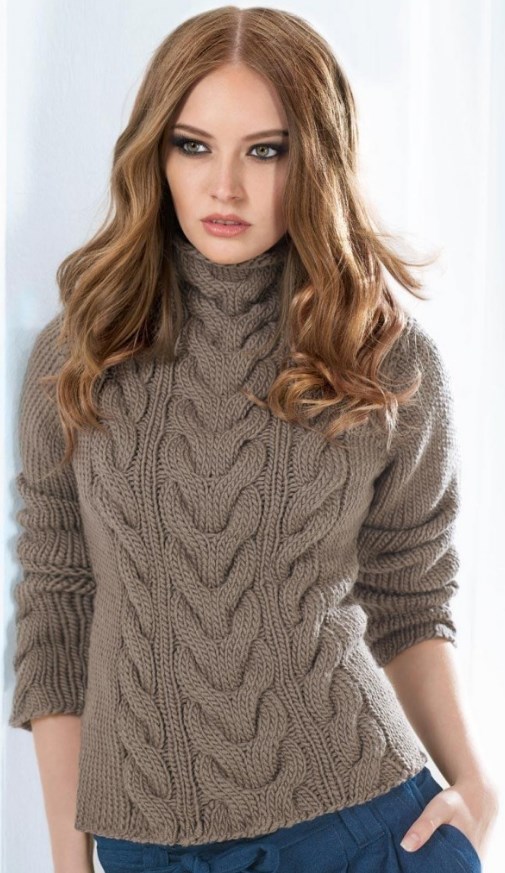 Далее выполняем швы по плечам, после чего переводим на круговые спицы ранее отложенные 28 петелек выреза горловинки передней и задней части свитера, замыкаем в круг и продолжаем вывязывать в узор прямо еще 7 см, закрываем все петли.