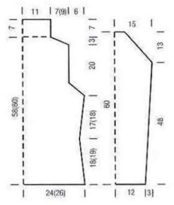 Для приталивания по обе стороны убавляем в кажд. 12 р. 2 х 1 п., далее на выс. 18 (19) см от набора по обе стороны прибавляем в след. 12 р. 1 х 1 п. и в след. 10 р. 1 х 1 п. (в кажд. 12 р. 2 х 1 п.).