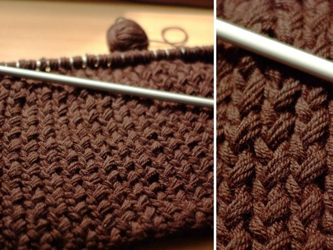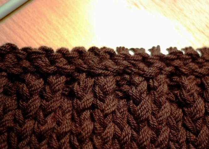 Набираем 34 (38) п. на спицы № 12, оставив хвостик нитки примерно на 50 см (его мы используем при сшивании). Вяжем прямыми и обратными рядами таким способом: 1 кромочн. п. (кромочн. п. вяж. лиц. гл.), *2 л. п., 2 и. п.*, повторяем от * до *, кромочн. п.