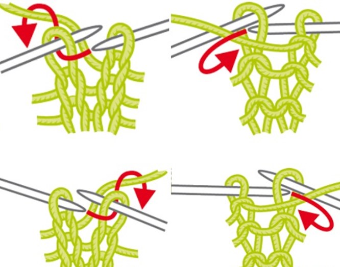 На картинке ниже в верхнем левом углу показано, как вывязывать лицевые петельки, справа – как делать изнаночные для правшей (снизу – для левшей).