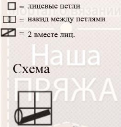 - Основной узор, который вяжется по предоставленной ниже схеме, в которой указаны лицев. и изнан. рядочки как они выглядят на лицев. стороне изделия. Лицев. р. читаем справа налево, изнан. р. – слева направо. В первом р. прибавляем, как указано в раппорте, 2 п. Провязываем 1-3 рр., после чего повторяем 4-15 рр. для узора. Первый ряд без номера относится к резиночке.