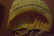 Мастер-класс будет закончен после того, как вы наберете петли по краям шапочки и свяжите несколько полос резинкой. Завязки выполняются крючком, с помощью которого нужно набрать пятьдесят пять звеньев и связать ряд столбиками без накидов. Теперь шапочка для новорожденного спицами полностью готова.