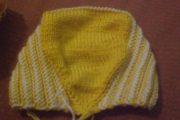 Возьмите пряжу из мохера и акрила, а также спицы под номером № 2. Наберите сто двадцать три петли и вяжите 28 р. платочной вязкой. Затем еще сорок пять полос лицевой глади. Закройте петельки. Потом вязаную полосу согните вдвое и подшейте. Это вы сделали окантовку для шапки. Затем необходимо сшить обычным швом сзади шапки. Поделите верхушку изделия на четыре части, а края соедините по центру. Сшейте изделие от серединки к краю. У вас должно выйти четыре шва. Сделайте своими руками помпоны и пришейте их сверху. Осталось сделать ушки по бокам. Отступите от заднего стежка тринадцать петлиц и наберите по краям 23 п. Выполните платочную вязку, уменьшая в рядах по 1 п. с двух сторон. Когда на спицах останется всего лишь 3 п., свяжите длинный шнурок. С другой стороны сделайте тоже самое. Такая теплая зимняя шапочка для новорожденных, обязательно согреет их в непогоду. Зимняя прогулка станет только удовольствием.