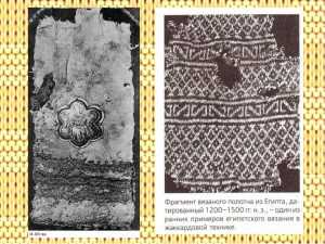 Это вязаные носки из коптских гробниц, а также трикотажные вещи, которые найдены в Перу.
