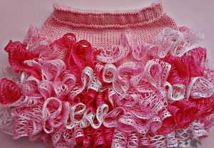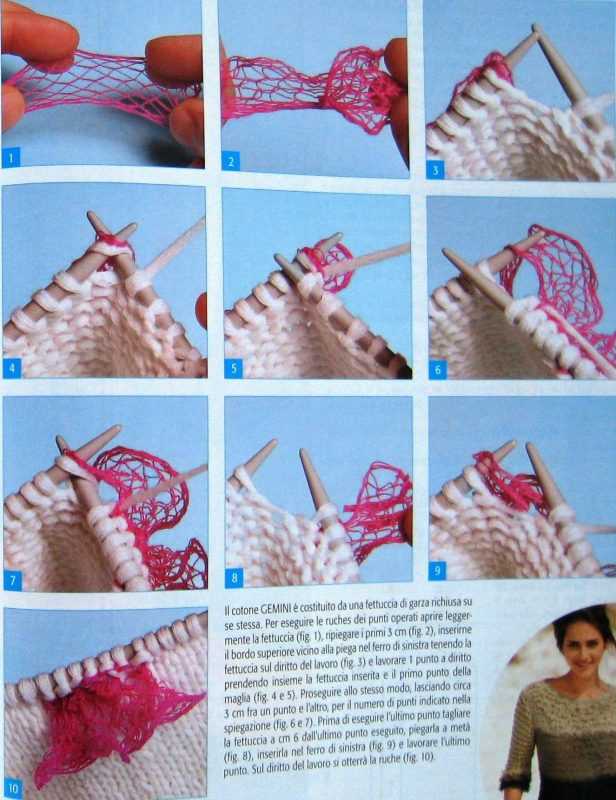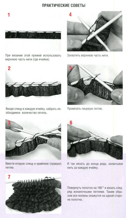 - При вязании необходимо четные ряды выполнять изнаночными петлями, чтобы все рюши находились на лицевой стороне полотна.