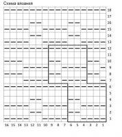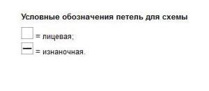 №2:лицевые петли (ЛП) – 4 шт., изнаночные (ИП) – 3 шт.,* 5 ЛП,3 ИП. При этом стоит уточнить, что * свидетельствует о том, что необходимо повторить все действия, начиная от этого знака и до самого конца рядочка. После этого делаем еще 4 ЛП.
