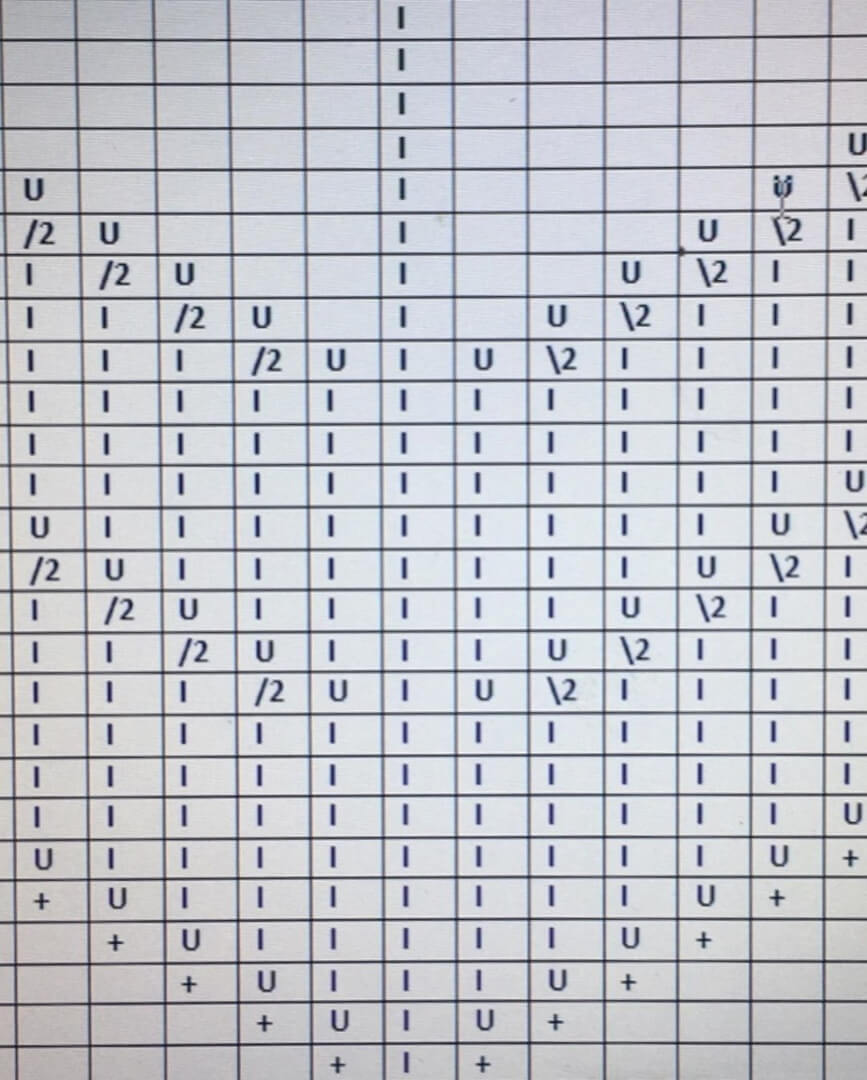 Ширину диагональных полос регулируем по желанию, важно чтобы стороны были симметричными. Среднюю петлю сохраняем по центру изделия.