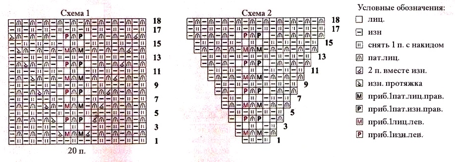 След. кр. р.: 2 ЛП, узором до М, переснять М, 3-ий кр. р. сх. 1 на 20 п., переснять М, пат. узором до 2 п. перед последней п. подъема, 2 ЛП, ЛП до конца кр. р.
