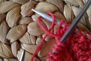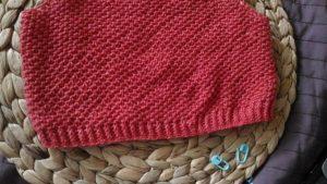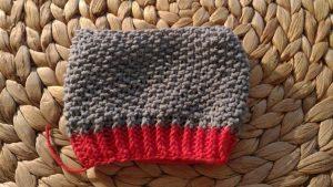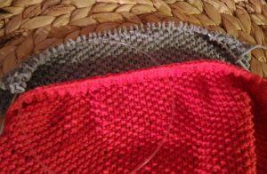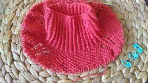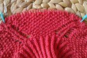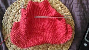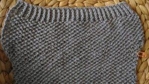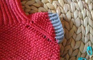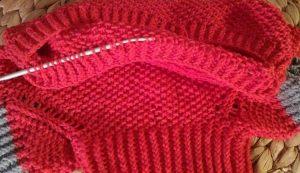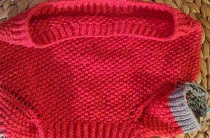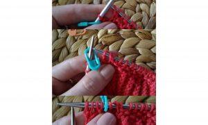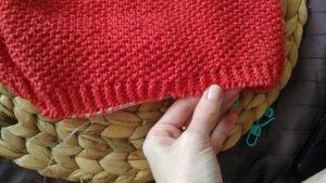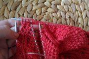 С внутренней стороны резинки, на спинке «свитера» набираем петельки на спицы.