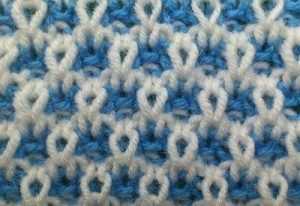 Продолжайте делать чередование петлиц до конца полосы. В новом ряду вам необходимо проделать те же манипуляции с чередованием звеньев. Только в этот раз лиц. п. начального ряда вяжут в следующей полосе изнаночными.