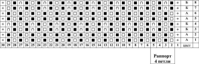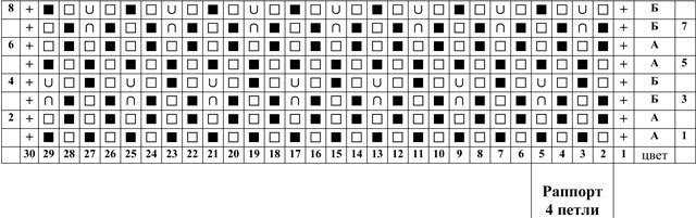 - 5 р. – поменяйте пряжу на ту, которая обозначена буквой А и вяжите полосу аналогично первому р.;