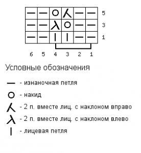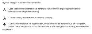 Пустая клеточка схемы, в которой нет никакого значка, вяжется изнаночным способом в лицевых рядах и наоборот.