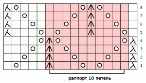 Раппорт второго узора имеет размер 10 петелек на 8 рядков.