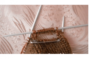 На одном будем вывязывать большой пальчик. Для этого 1 петельку провязываем лицевой, а следующие 10 переносим на булавку и пока оставляем. Булавку лучше застегнуть, чтобы петельки «не убежали».