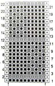 - 2Р.: там, где был съем + Нк – вяжем их как лицевую, изнаночную петлю выполняем по рисунку.