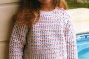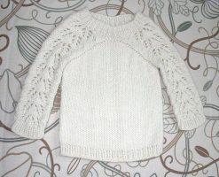 Передняя часть изделия вяжется аналогично, только горловина более глубокая. После изготовления всех частей свитера, необходимо соединить детали. Сначала сшиваем плечевые швы изделия, а затем обрабатываем рукава по низу. Для обработки рукавов набираем на спицы петельки нижнего края и вяжем резинку необходимой высоты. Для обработки горловины лучше воспользоваться круговыми спицами. Горловину можно завершить резинкой или лицевой гладью. После всех доработок, стоит сшить боковые швы и швы рукавов. Ажурная модель для девочек готова.