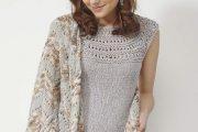 Такая накидка спицами добавит тонкости вашему образу не только для украшения вечернего платья, но и для любой вещи из вашего гардероба. Для работы понадобится пряжа светло-серого цвета и еще контрастная нитка. Круговые спицы под номером № 4,5, прямые спицы № 5 и крючок такого же размера. Вязаная плотность составляет 18 п. на 19 р. = 10 на 10 см. Накидка спицами вяжется от основной части к кайме.