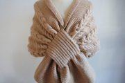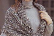 Для воротника необходимо набрать на округлые спицы по правому удлиненному краю пелерины двести звеньев. Одновременно нужно присадить немного этот край. Изделие замкните в круг и вяжите круговыми линиями. Когда высота воротника достигнет четыре сантиметра, свяжите в каждом ряду по 25 изн. п. В следующих круговых линиях выполняйте в каждой полосе по две совместные лиц. п. А затем еще раз, только совместные две изн. п. Вязаная пелерина для женщин еще не закончена, продолжайте все выполнять по узору. Когда высота воротника будет двадцать четыре сантиметра, закрывайте оставшиеся петлицы по рисунку.