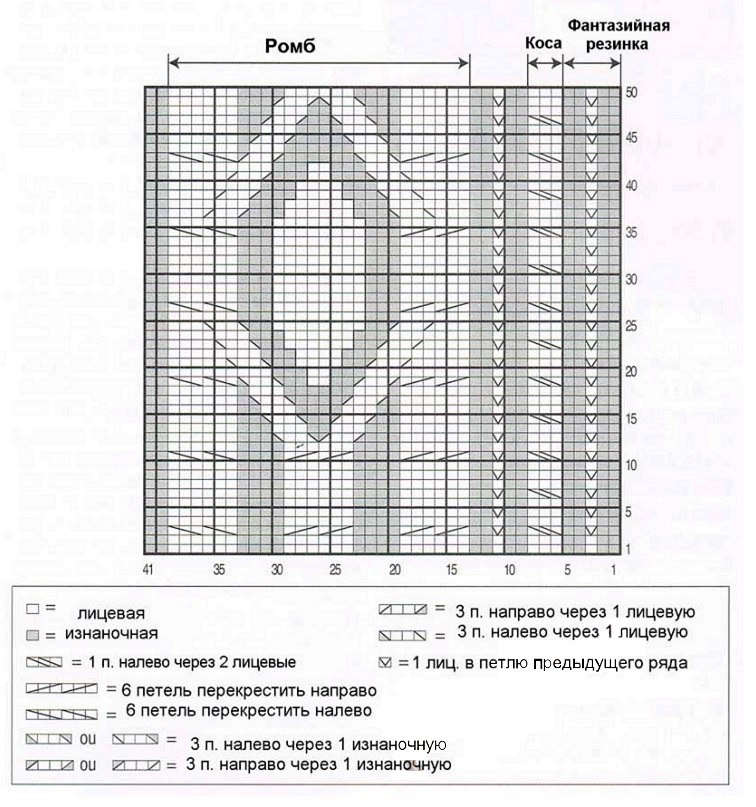 Набираем спицами 140п. и вяжем: 8п. – “Рис”, 5п. – фантазийная рез-ка, 3п. – “Косы”, 5п. – фантазийная рез-ка, 26п. – “Ромбы”, 5п. – фант. рез-ка, 3п. – “Косы”, 5п. – фантазийная рез-ка,20п. – “Рис”, 5п. – фант. рез-ка, 3п. – “Косы”, 5п. – фантаз. рез-ка, 26п. – “Ромбы”, 5п. – фант. рез-ка, 3п. – “Косы”, 5п. – фант. рез-ка, 8п. – “Рис”.