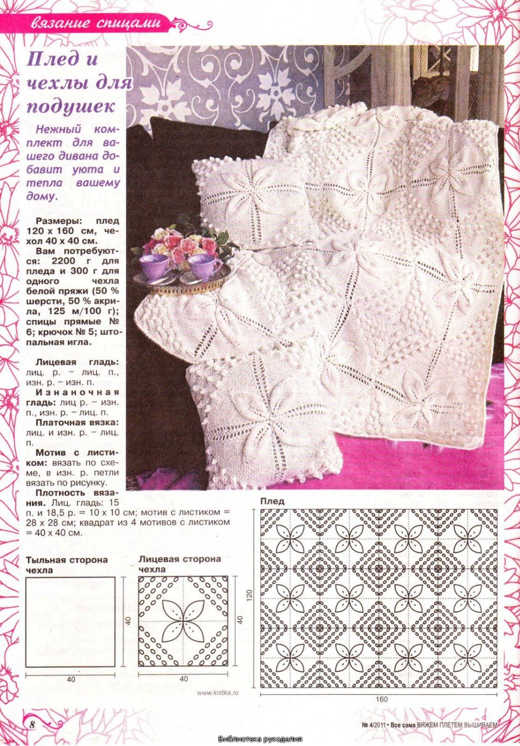 Провязав покрывало на 23см (=44р.), на участках узора “Рис” начинаем выполнять *2р. лиц. гладью, затем – 6р. платочного рис-ка, 2р. лицев. гл., затем возвращаемся к уз. “Рис” и вывязываем 50р.* – от * и до * повторяем спицами на нужную высоту до полного р-ра детали.