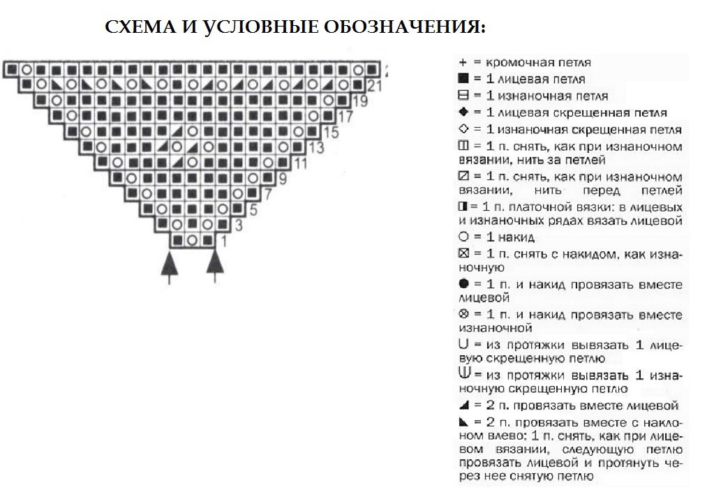 На схеме показаны только лиц. рядки, в изнаночных все петельки связать по рис-ку. Накиды в изнаночн. р. провязываем изнаночными п. В каждом круговом р. четырежды повторяем раппорт между стрелками.