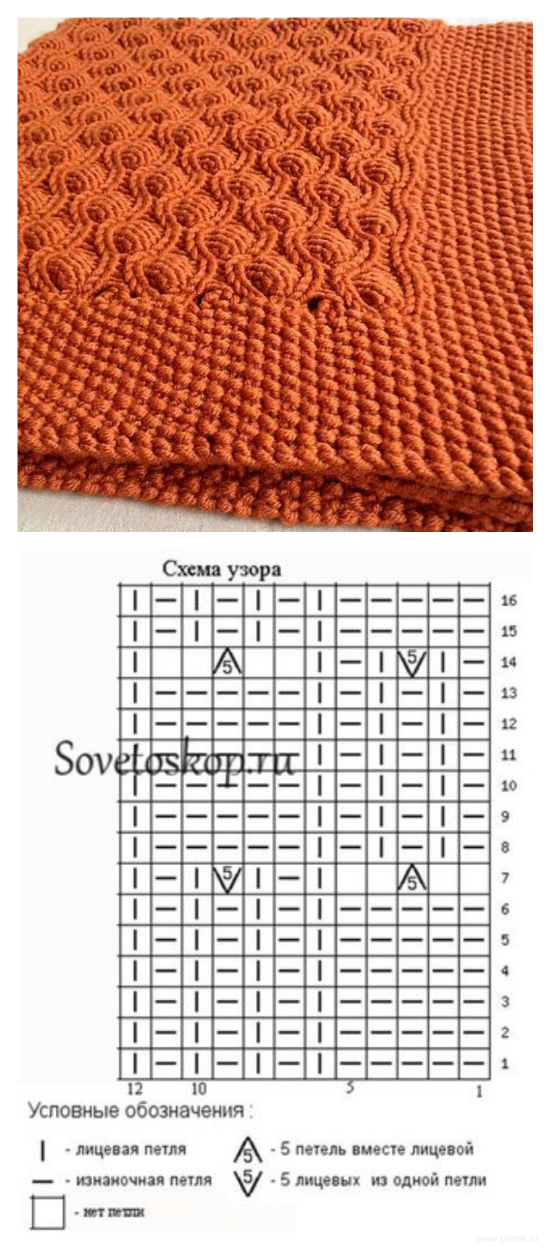 Продолжаем работу спицами, повторяя с 1р. по 4р. двойной жемчужный уз., петельки рельефного рис-ка вязать по сх.