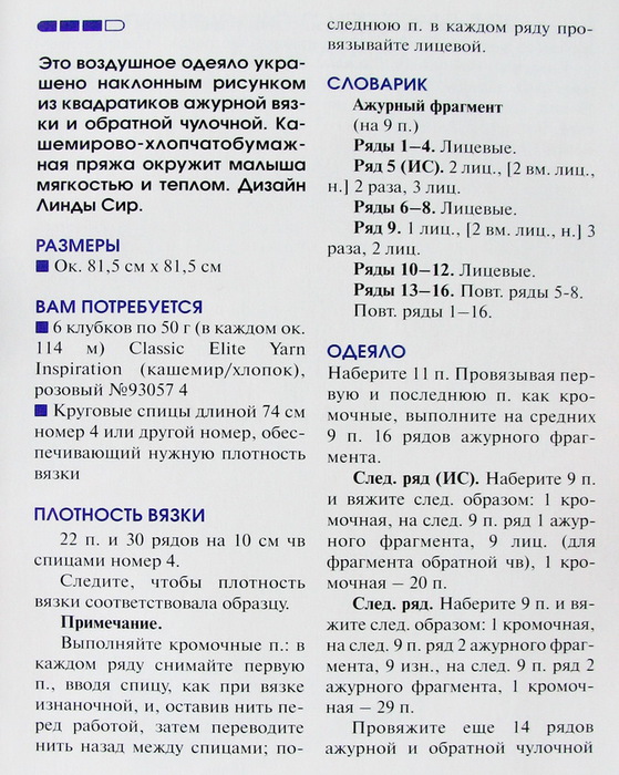 Плотность: на ажурном узоре спицами No6,5 23 круговых рядка равны 10см на 10см.