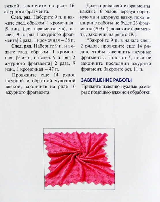 Выполнив 398р. (=210см) и провязав 12-ый р. “Ромбов”, заканчиваем работу закрытием всех п.