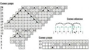 Основа вязания на спицах идет согласно схемы. Основа вязания крючком состоит из соединительных столбцов, воздушных петелек, столбцов без накида и столбцов с накидом.