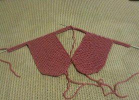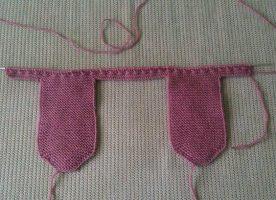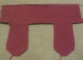 Чтобы связать козырек необходимо набрать двадцать две петли и также делать выше описанный узор, делая прибавления в каждой полосе с двух сторон по две штучки. У вас должна получиться общая численность петлиц – тридцать штук. Затем снова вяжите двадцать шесть р. по прямой, как показано на фото.