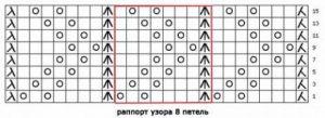 На схеме изображены только лицевые линии. Изнаночные следует выполнять согласно рисунка. Накиды выполняются изнанкой. Раппорт орнамента состоит из восьми петлиц в ширину. Перед ним необходимо сделать восемь звеньев, а после – девять. В высоту узор «змейка» повторяется с первого по шестнадцатый р.