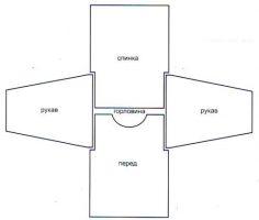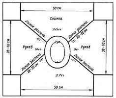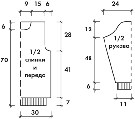 Основные полотнища — спинка и передняя часть, вяжутся прямо. Количество петель остается тем же до уровня подмышек. После этого начинается убавление петель для проймы. Петли можно не убавлять вовсе, тогда получится рукав со спущенным плечом. Убавлять прямоугольником, закрыв сразу несколько крайних звеньев в одном ряду и овалом — постепенно плавно закрывая звенья проймы.