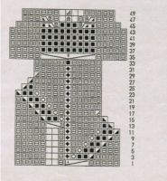 Обратите особое внимание на тот факт, что на схематичном рисунке кроме привычных обозначений есть также небольшие синие клеточки. Они нарисованы для наглядности, чтобы было удобнее работать, и мастерицы сразу видели места, в которых не должно быть петель.