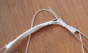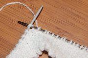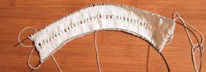 Теперь необходимо соединить начало полотна с последней полосой. Этот этап будет немножечко сложнее, чем предыдущий. Сложите заготовку вдвое и перенесите поочередно все петельки на другие спицы. На фото показан этот процесс. Новый изнаночный ряд провязывается такими же петельками, только из двух штучек нужно делать одну.