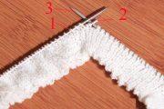 Затем переверните изделие на лицевую сторону и вяжите петельки основной пряжей. В следующей полосе необходимо увеличить количество петлиц. Свяжите узор резинки один на один таким способом: изнаночные звенья должны находиться над такими же петлями, а в их промежутках нужно провязывать лицевые. Далее снова переверните заготовку и выполните несколько полос резинки. После этого вяжите любой узор, который вы умеет делать или который соответствует рисунку вашей вязаной вещи. А чтобы ваша кайма не стягивалась, наберите на двадцать петлиц больше, чем положено.
