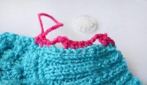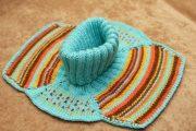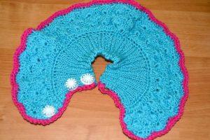 Далее работа будет проводиться крючком. Первая линия будет выполняться столбиками без накида, с помощью вытягивания петельки из петли, провязанных спицами. Следующий ряд также легко связать, прибавляя петлицы в двойне. Вам необходимо каждое звено предыдущей полосы провязывать двумя столбиками без накида. С помощью таких манипуляций, она будет закрывать плечи ребенка.