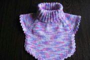 Спинка манишки делается аналогичным способом. Петли со спины перенесите на круговые спицы, чтобы продолжить вязание воротника. Поднимите четыре звена в том месте, где было сокращение петлиц спереди и четырнадцать штук сзади. Провяжите еще 10 см в высоту и закройте оставшиеся петельки крючком. Детская манишка собирается очень просто, путем сшивания плечевых швов.