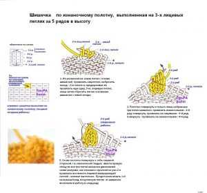 Общий принцип вывязывания шишечек – это выполнение нескольких узелков из одной петельки и нескольких рядов для этих узелков с последующим резким убавлением этих петель.Для начала рассмотрим подробное описание и схемы вязания этих элементов из 3-х петель.