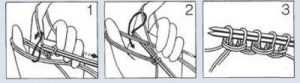 Спицами набирается 62 петли методом «болгарский зачин», т.е. с утолщенным краем. Метод состоит в том, что все нечетные петли набираются с внутренней стороны большого пальца (рисунок 2), а четные – с наружной (рисунок 1).