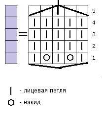 Дальше начинается основной узор: первый ряд: *3 лицевые, 1 изнаночная, 1 патентная лицевая, 1 изнаночная*, между * * схема повторяется; патентная лицевая – это накид и следующая снимается без провязывания, обратно они вяжутся вместе изнаночной; второй и все парные: * 3 изнаночные, 1 лицевая, накид, изнаночная снимается без провязывания, 1 лицевая*, между * * повтор; третий: *3 лицевые, 1 изнаночная, 1 лицевая вместе с накидом, 1 изнаночная*. Затем повторяется только второй и третий ряд.