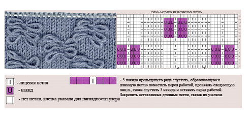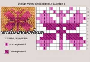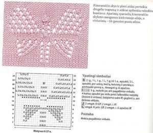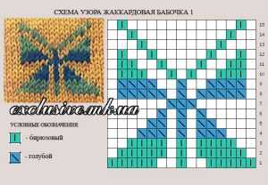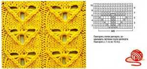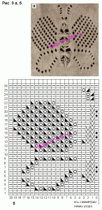 Еще один интересный орнамент представлен вниманию рукодельниц. Вяжется также с применением сброшенных накидов, но с перетяжкой по центру для образования тельца насекомого. Рапорт мотива 38 п. и 26 р., бабочка раскинула крылышки на 10 р. и состоит из 9 спущенных петель разной длины: