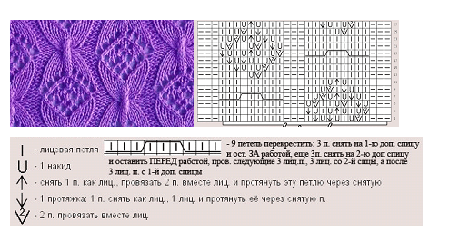 Важно! Схема узора немного сложная за счет перекрещивания 9 п. Для работы понадобится 2 вспомогательные спицы, уровень мастерства и предельная внимательность: