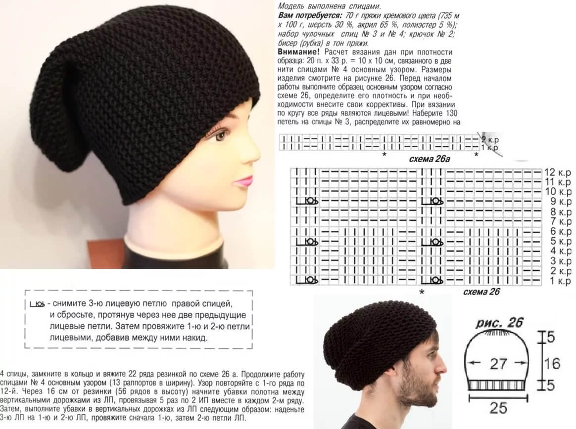 Переходим на лиц.гладь. Выполняем этот узор до общей высоты шапки 20; 21 см. Затем равномерно убавляем 6 х 1 п. Остаётся 42; 48 п. Повторяем убавления в каждом чётном р. 5; 6 раз, сохраняя вертикальную линию убавлений на одних и тех же местах. Остаётся 12 п. Стягиваем их, закрепляем нить.