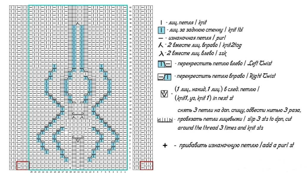 Вывязываем 1 ряд изнаночных п., затем переходим на резинку 2 лиц/п на 1 изн/п. Провязываем 8 рядов. Далее распределяем петли следующим образом: 38 п. – резиночка, М, 22 п. – узор по схеме, М, 36 п. – резиночка.